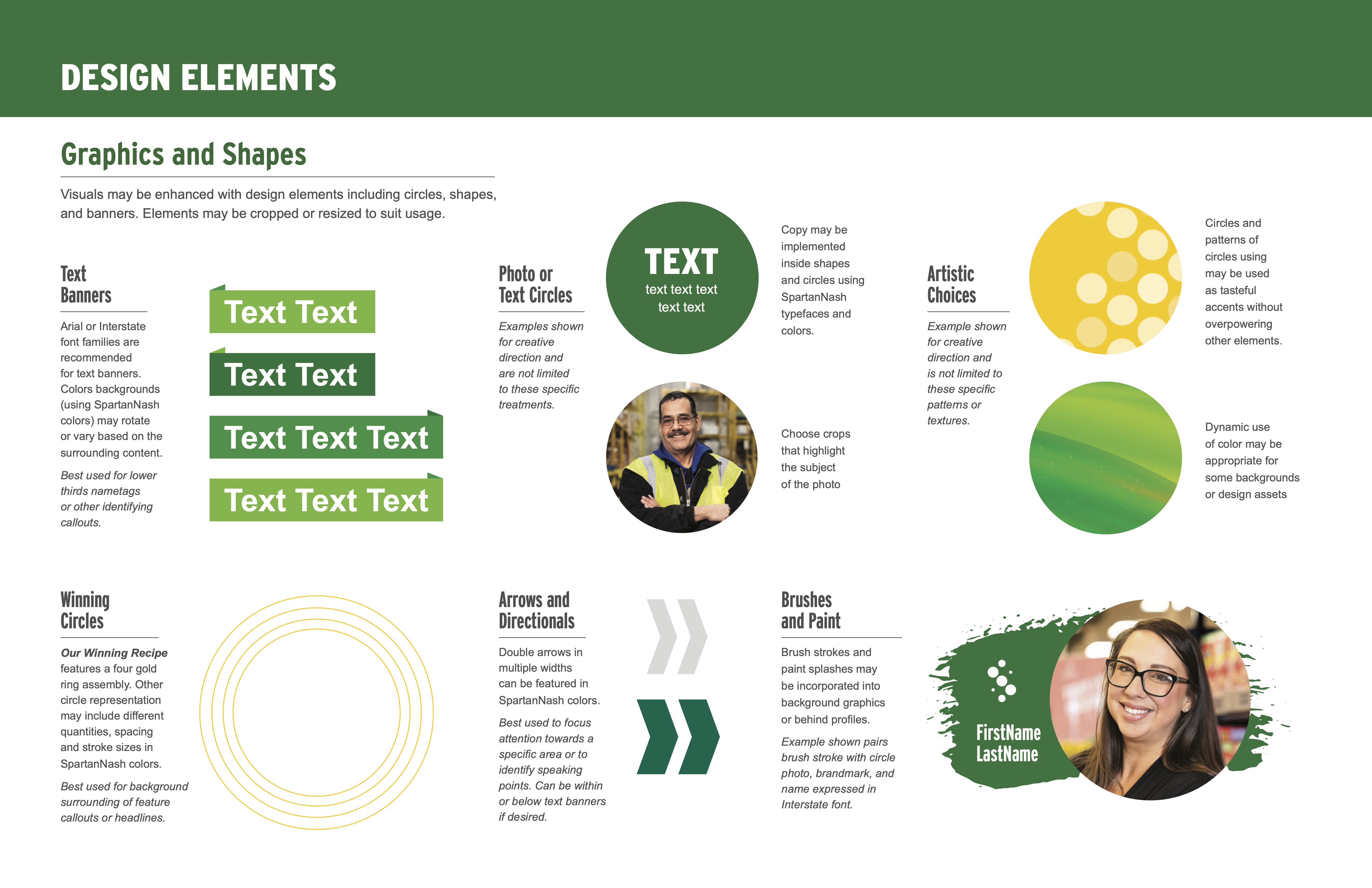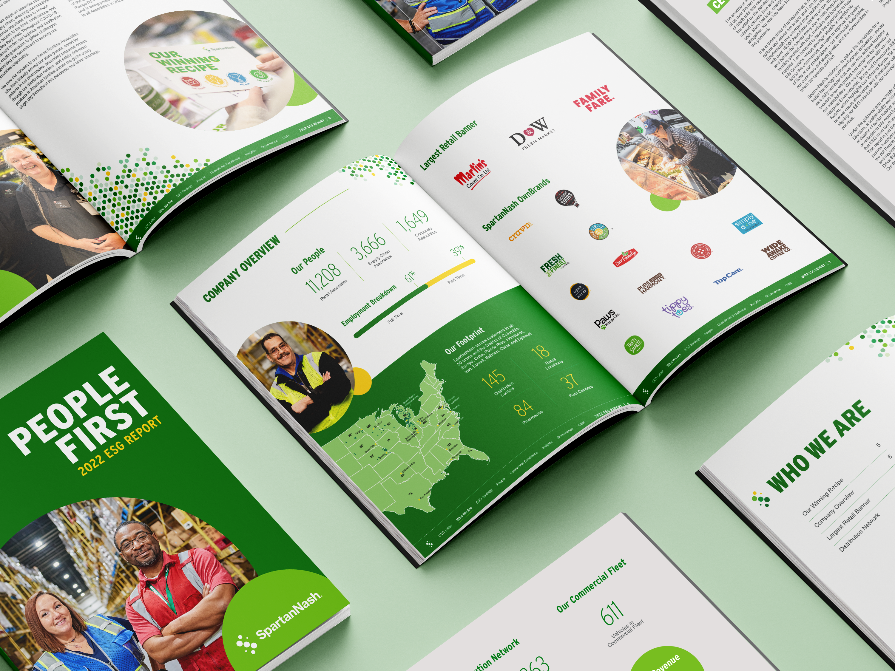 I worked with SpartanNash’s brand guidelines to develop my concept. I used circular elements to represent the vast data collected over the years, featured in their ESG report. Text banners were added to capture attention and guide readers through each new section of information.